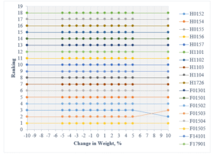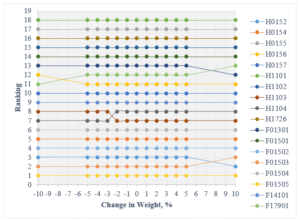 D equals: Where Ai = the itth alternative under consideration, Bj = the jth criterion under consideration, xij = the numerical result of the ith alternative with regard to the jth criterion. TOPSIS follows these steps: First build the normalized decision matrix by x_ ij divided by √. (∑_ (i = 1) ^ mij^2). Second step: build the weighted norma1ized decision matrix by means of w_ j×r _ ij. Third step: identify both ideal and negative-ideal solutions: Let A+ and A- be defined as two synthetic substitutes with respective meanings: [(max Vij), i=1,2, 3….m, j=1,2, 3, n] = V_ j〗^+= (V_1^+, V_2^+, V_3^+, ……V_ n^+) V_ j〗^-= (V_1^-, V_2^-, V_3^-, V_ n^-) = [(min Vij), i=1,2, 3, V_ n^-]. Fourth step: determine the separation measure. The n-dimensional Euclidean distance allows one to quantify the distances between every possibility. Then, i=1,2, 3,.m gives the separation of every alternative from the ideal one by S_ i^+= √(∑_(j=1) ^n Rye) ^2). i=1,2, 3,.m S_ i^-= √(∑_(j=1) ^n Rye (V_ ij- V_ j^-) ^2). Step 5: Determine the relative closeness to the ideal solution: C_(i+) = (S_ i^-)/ (〖 (S〗_i^++S _i^-)). Ai’s relative closeness to A+ is defined as Step 6: Sort the preference order: Ci+ allows one to rate a set of alternatives in declining order. Following TOPSIS analysis, the outcome with highest priority was validated using Kendall’s coefficient of concordance (W). First of all, utilizing AHP and TOPSIS, priority ranking of all road sections was produced for every expert’s response. The detail phases in Kendall’s coefficient of concordance (W), are First step: For every Link find the total of the ranks (R_ j) assigned by every k judge; Step 2: Find (R_j) and thereafter get s as follows: s=∑ (R_ j-(R_ j) ̅) ^ 2. Work out W’s value in step three by applying the following formula: w= (12x s)/ (K^2 (N^3-N)) Where k= number of specialists = 20 and n= number of road links = 18? Here, n=7, Chi-Square is applied. φ=k(N-1) W Using degree of freedom equal (N – 1). The computed value of φ^2 is compared with the table value of φ^2 at 5% level for N – 1 = 18 – 1 = 17 degree of freedom; so, the appropriate selection was made. Sensitivity analysis was done to test the strength of the prioritizing after determining the final rank of every road. In Multi-attribute decision making issues, most of the data are variable instead of consistent and steady. Sensitivity analysis following problem solving can thus help to make accurate decisions rather successfully [14]. From [15], the SA process consists; Suppose ω _j, j=1, 2, 3…p…. n, is the weight to the factor “j,” then total of weights must be equal to 1. ∑_(j=1) ^nyx. Under these presumptions, the weight of one attribute changes in line with the weight of other attributes; the new vector of weights changed into ω _ j〗^’, j=1,2,3…p… n. Suppose ∆_p is the weight change to parameter p; then, new weight to parameter p is obtained by ω _p〗. ^’=ω _p +/-∆_p. New weights to remaining parameter are now obtained from ω_ j^’= (1-〖ω_ p〗^’)/〖1-ω〗_p. Sum of new altered weights has to equal 1 ∑_(j=1) ^nyx ω _j’=1〗. one these fresh weights are computed; one more new ranking is computed.